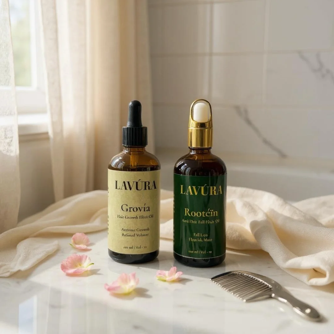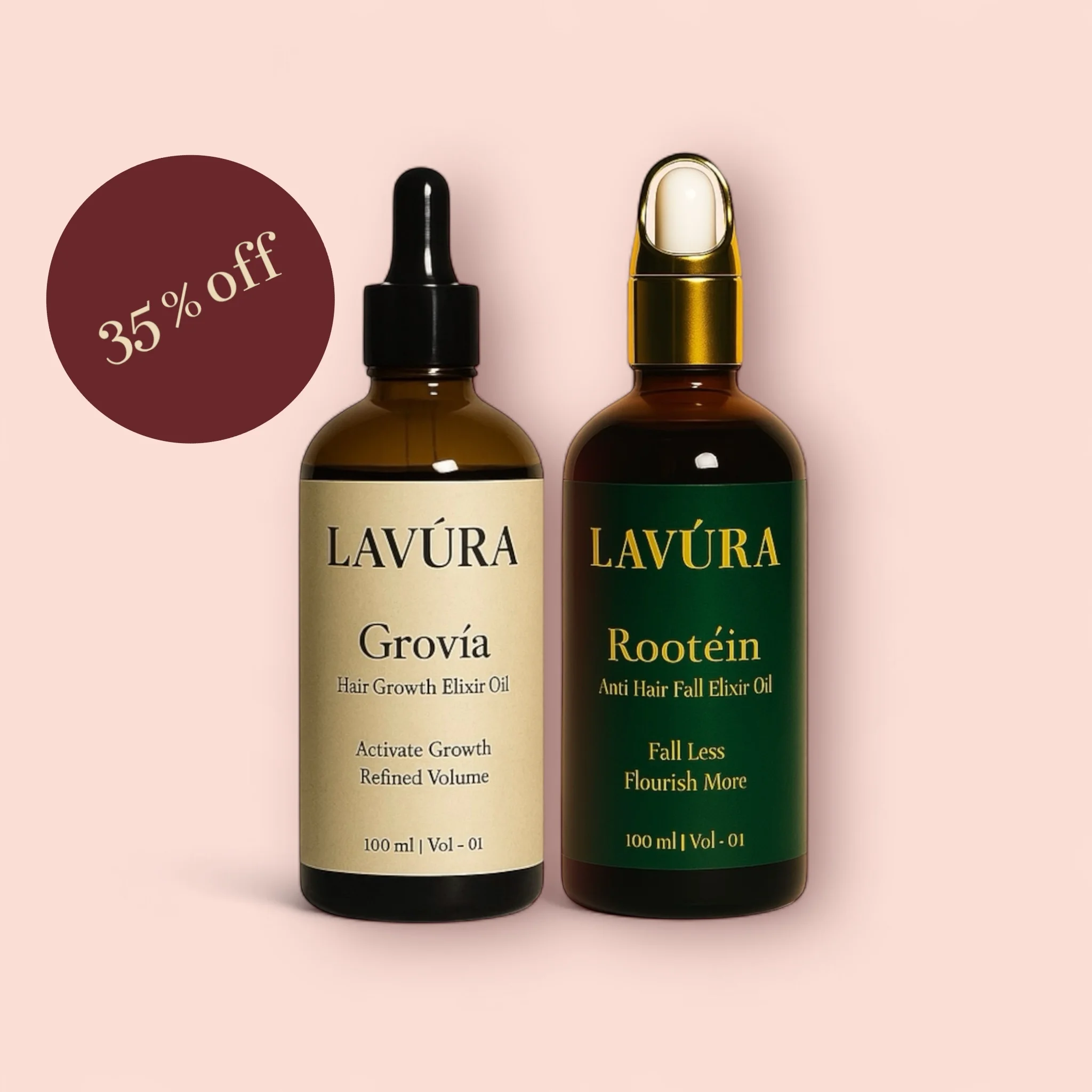 Lavúra’s Essential Duo brings together two of our most loved elixirs — crafted to target both ends of your hair care journey: